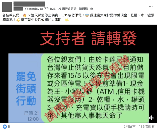 台当局急于发布公告回应,原因是近期岛内流传“3月15日台湾将‘断气’”的说法。
